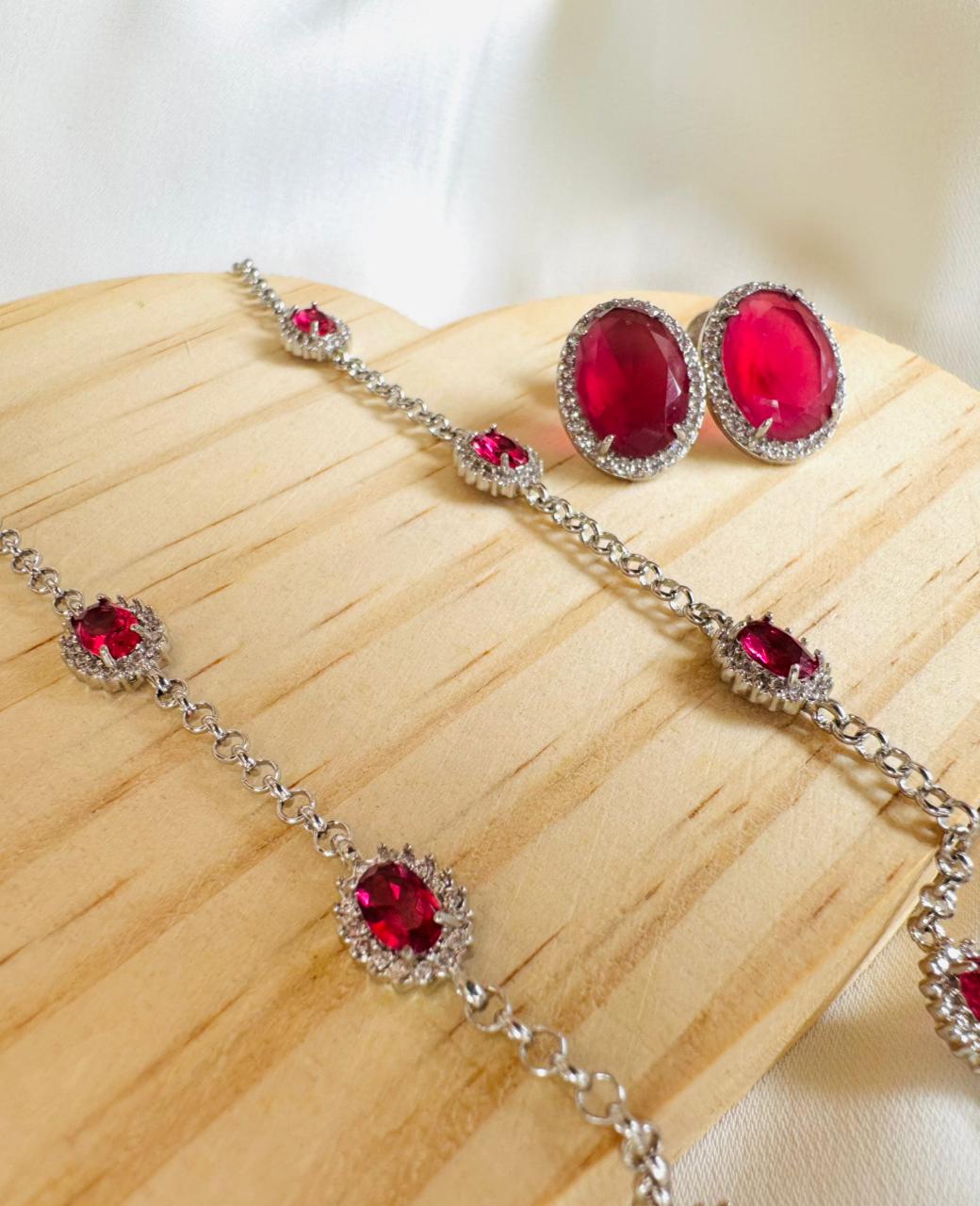 O brinco complementa o conjunto com um formato oval delicado, trazendo a rubelita ao centro, envolvida por zircônias brancas ao redor, resultando em uma peça equilibrada, elegante e atemporal. Um conjunto perfeito para ocasiões especiais ou para elevar produções sofisticadas com charme e personalidade.