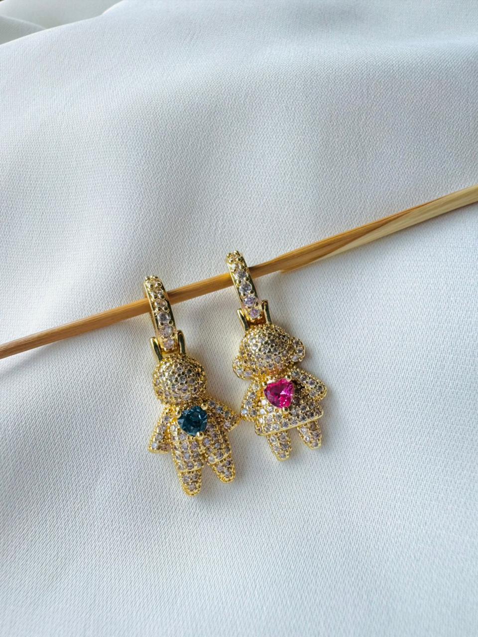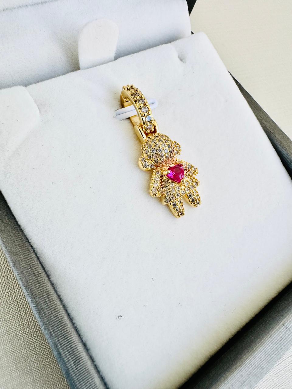 O pingente em banho ouro 18 k apresenta formato de menina, com superfície totalmente cravejada por zircônias que garantem brilho uniforme e destaque ao design. No centro, a zircônia rosa cria um ponto de contraste sutil e bem definido.