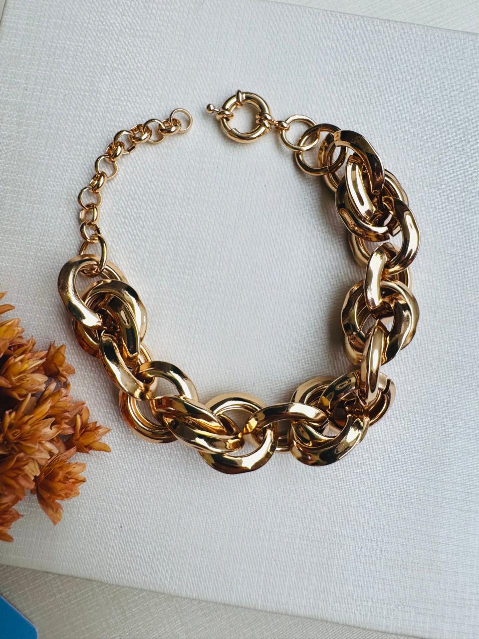 Pulseira de corrente robusta com elos grandes, banhada em ouro rosé, trazendo um visual moderno e sofisticado. Possui fecho joia seguro e extensor de 5 cm, permitindo ajuste confortável no pulso.