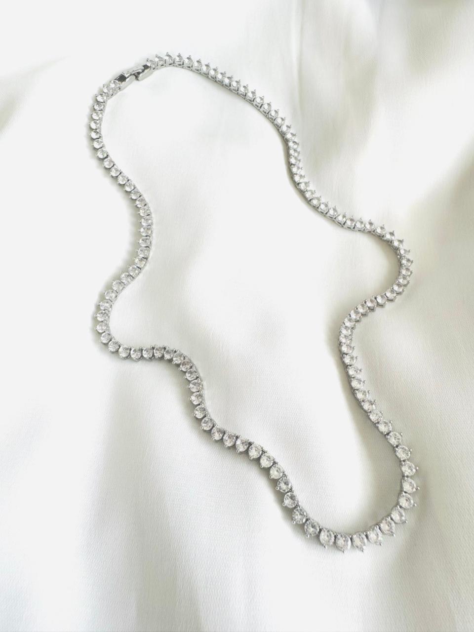 A choker estilo riviera é composta por uma sequência contínua de zircônias brancas lapidadas em formato de gota, alinhadas com precisão ao longo de toda a peça. O banho em ródio branco valoriza o brilho das pedras e confere um acabamento sofisticado, com aparência uniforme e luminosa.