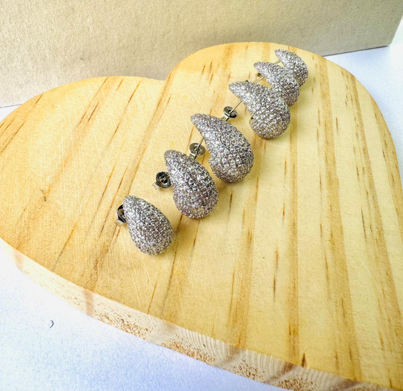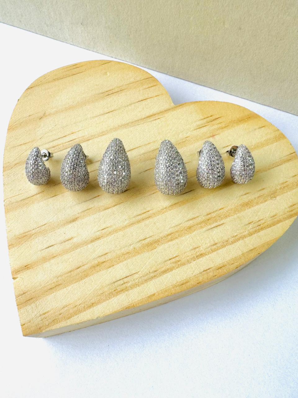 Composto por três tamanhos — pequeno, médio e grande — o trio apresenta design em formato de gota, totalmente cravejado com zircônias, garantindo brilho intenso e acabamento refinado. O banho em ródio realça ainda mais a luminosidade das pedras, proporcionando um visual elegante e contemporâneo.
